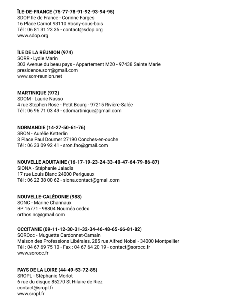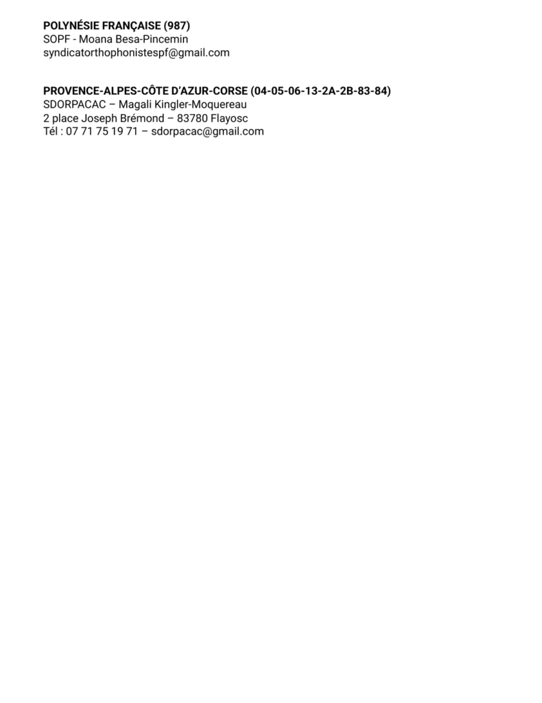 - Polynésie Française : Syndicat des Orthophonistes de Polynésie Française (SOPF). Courriel : syndicatorthophonistespf@gmail.com