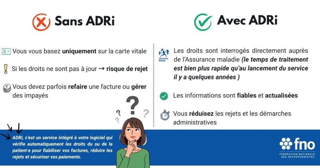 ADRi (Acquisition des droits intégrée) est un service proposé par l’Assurance Maladie qui permet à votre logiciel métier de récupérer automatiquement les droits actualisés du ou de la patient·e lors de la facturation.