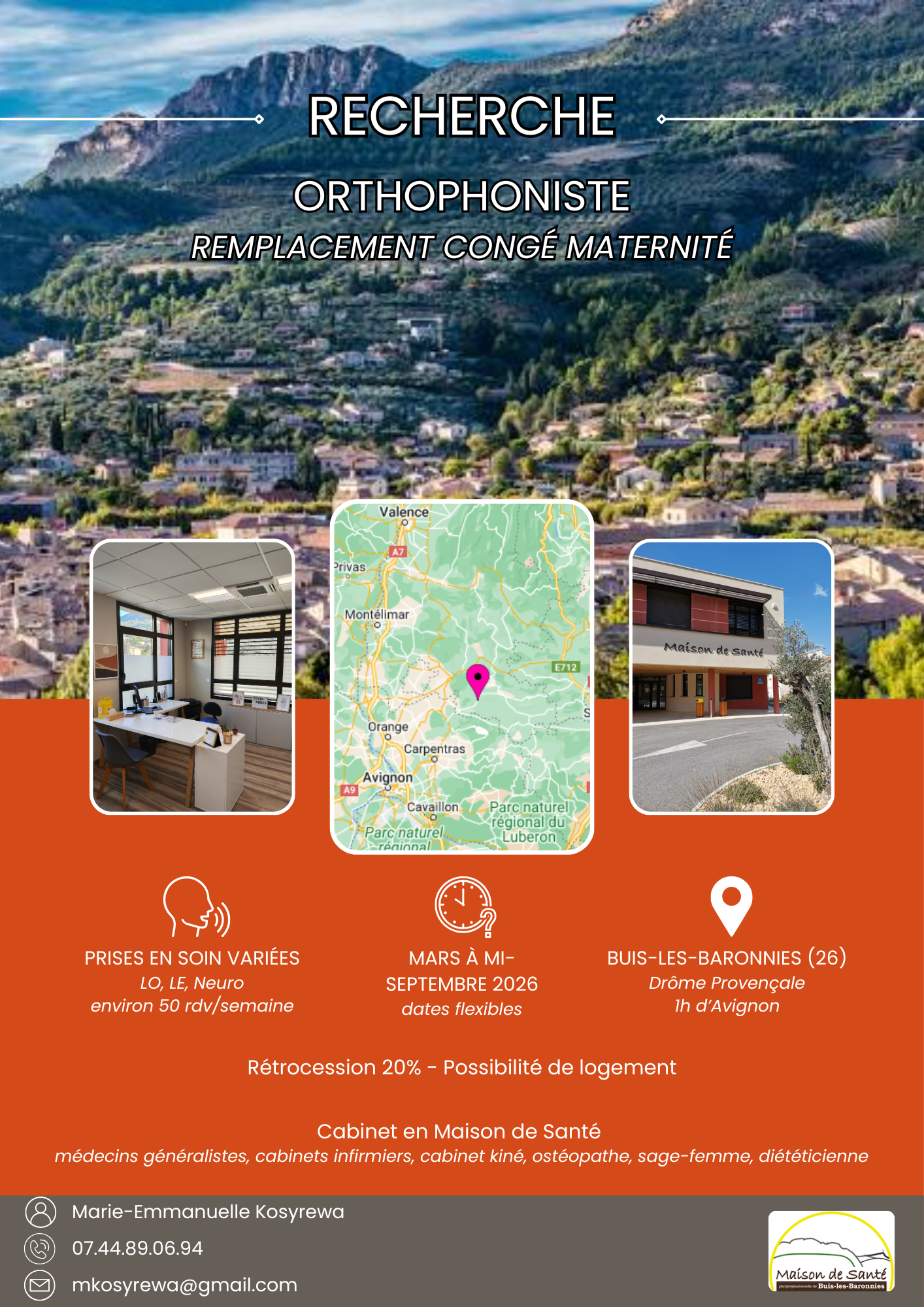 REMPLACEMENT CONGE MATERNITE Mars - Mi-septembre 2026 Buis-les-Baronnies (26 Drôme) Je recherche un.e orthophoniste durant mon congé maternité, au sein de la Maison de Santé de Buis-les-Baronnies (médecins généralistes, cabinet kiné, ostéopathe, diététicienne, sage-femme, cabinets infirmiers, psychologue). Patientèle : LO, LE, Neuro Nombre de rdv / semaine : environ 50, du lundi au jeudi, mais peut être élargi Rétrocession 20% Possibilité de logement au rez-de-chaussée de mon domicile (studio meublé avec entrée indépendante) : 550€