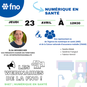 Suite à certaines nouveautés numériques en lien avec votre exercice professionnel, un webinaire a été organisé et animé par Elsa Wessbecher, vice-présidente chargée des territoires en présence de représentant·es de l’Agence du numérique en Santé (ANS) et de la CNAM (Caisse nationale d’assurance maladie) avec la participation de :